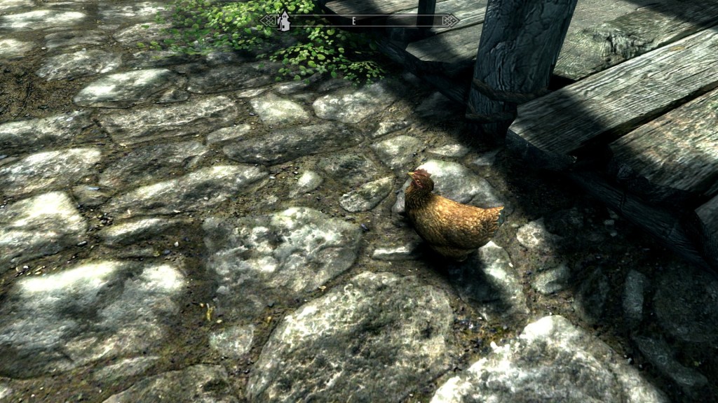In my mind, they are sacred because they are a subtle yet meaningful reminder that Skyrim is a living, dynamic, beautiful, expansive, depthful world. It is a world in which a person can sink days upon weeks upon months of real time into and, when looking back, feel like barely an hour has passed. It is a game whose world has such profound depth that even elements such as a simple chicken can remind us players that the region of Skyrim and the continent of Tamriel are truly alive, truly dynamic, truly living within the limitations of what a video game can accomplish. These chickens are reminders that the world around us is as much in motion as we are. They possess a silent glory, a noble simplicity, that draws players to regard them as special among all the beasts and wildlife of Skyrim (aside from the dragons, of course; they’re the real stars of the show).