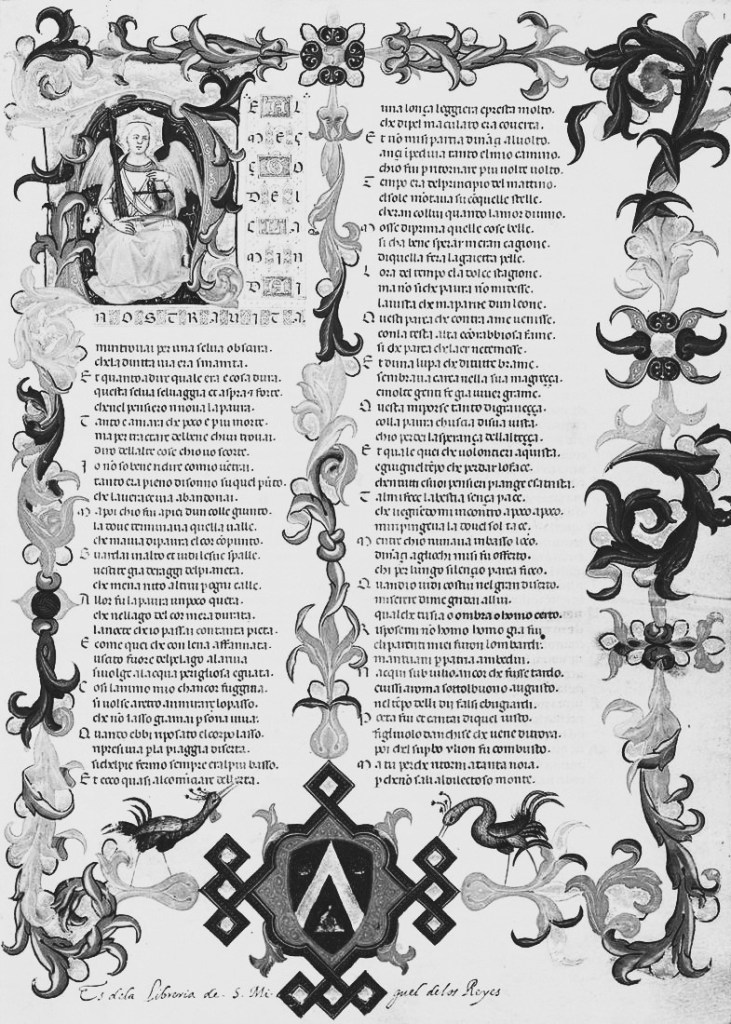 A page from an illuminated manuscript edition of Dante’s Divine Comedy, illustrated by Italian monastic and illuminator Don Simone Camaldolese.